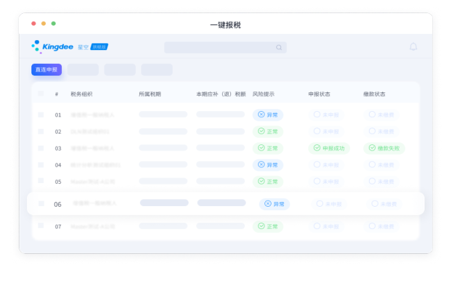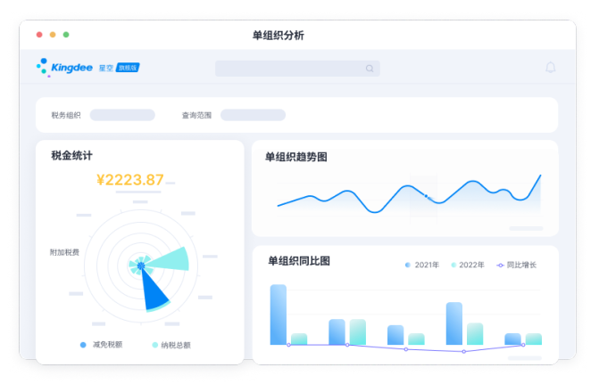 金蝶云·星空税务云,为企业解决税务管理过程中数据收集、税金计缴、风险管控等问题,提供智能算税、一键报税、税务分析、风险预警等服务,大幅提升税务工作效率及合规管理水平